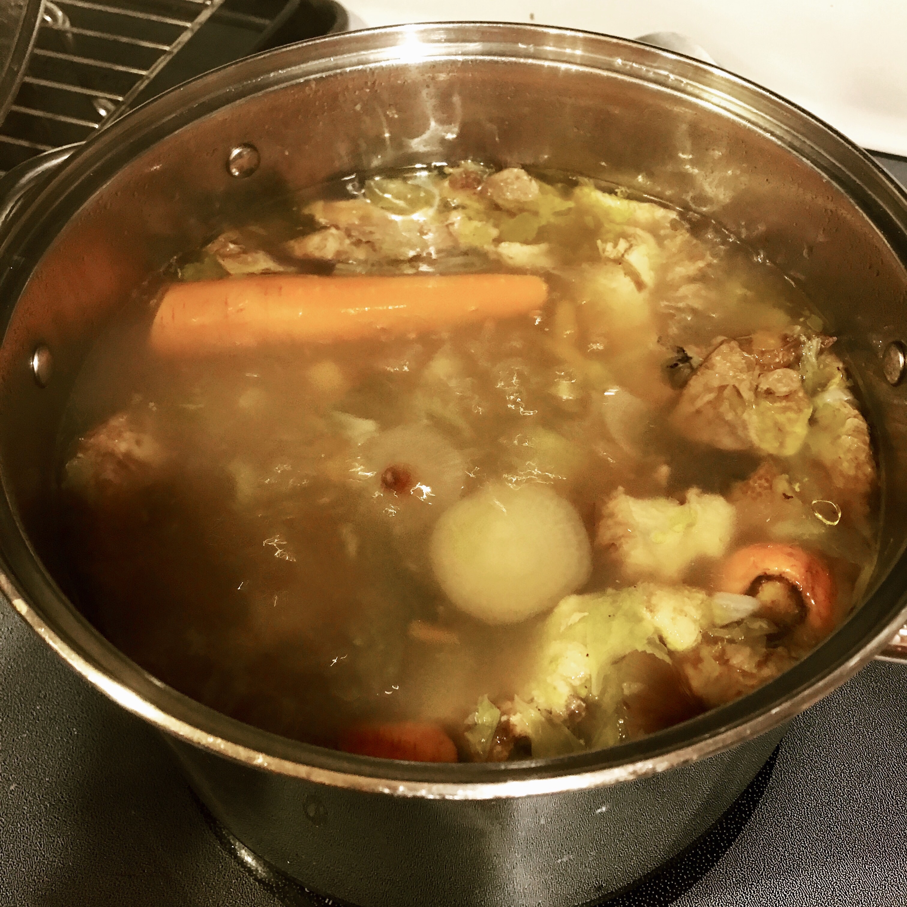In addition to all the chicken parts; bones, skin and meat. All the veg scraps you collect and have waiting in the freezer I also will add a little salt, some fresh ground black pepper and a couple of bay leaves. If you start your stock early in the morning, I mean like 5/6 a.m., and allow it to simmer all day you will have stock by evening ready to go. If that time doesn’t work for you put it all in a crock-pot. Use the low setting and come back to it later. The ideal length of time to cook it is 24 hours. This allows time for all the healthy collagen to come out of the bones. I’ve successfully made fabulous stock in 8-10 hours as well.